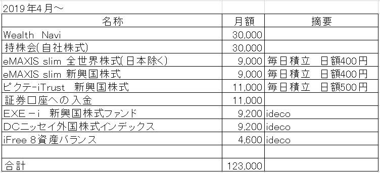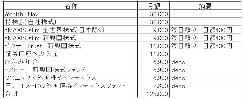 ウェルスナビと持株会が3万、次のeMAXIS~証券口座への入金という項目までが合計で4万、idecoの各項目で合計2.3万、総合計が12.3万という状況でした。